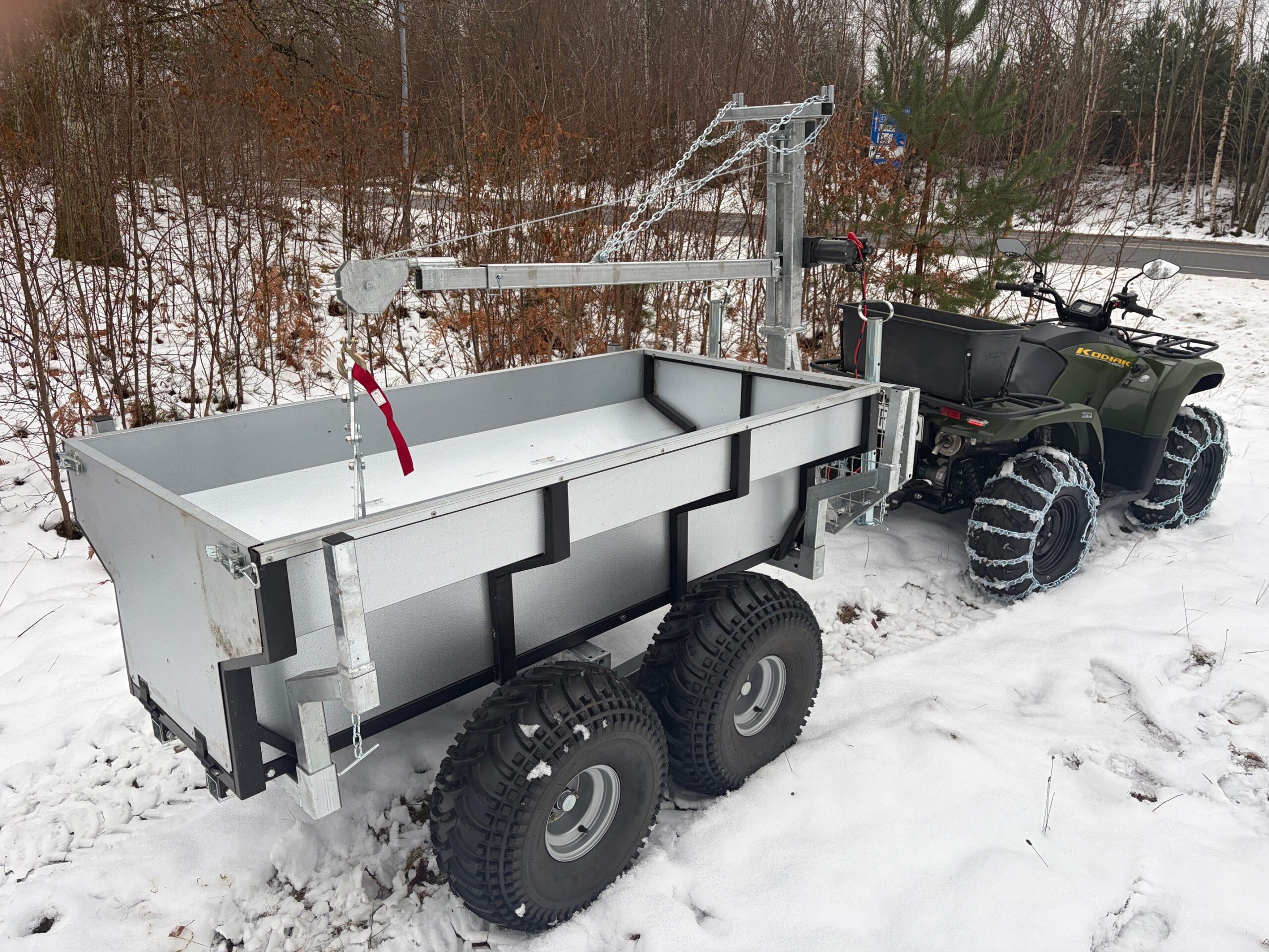 Vagn för ved, massved och klentimmer med plant lastplan och avtagbara stöttor för horisontel placering för lättare avlastning, vilket förenklar när virket rullas av och det hamnar en bit från vagnen. Kranen med höj och sänkbar bom- drar max 80 kg. Vinschen är en Warn DC 2000.